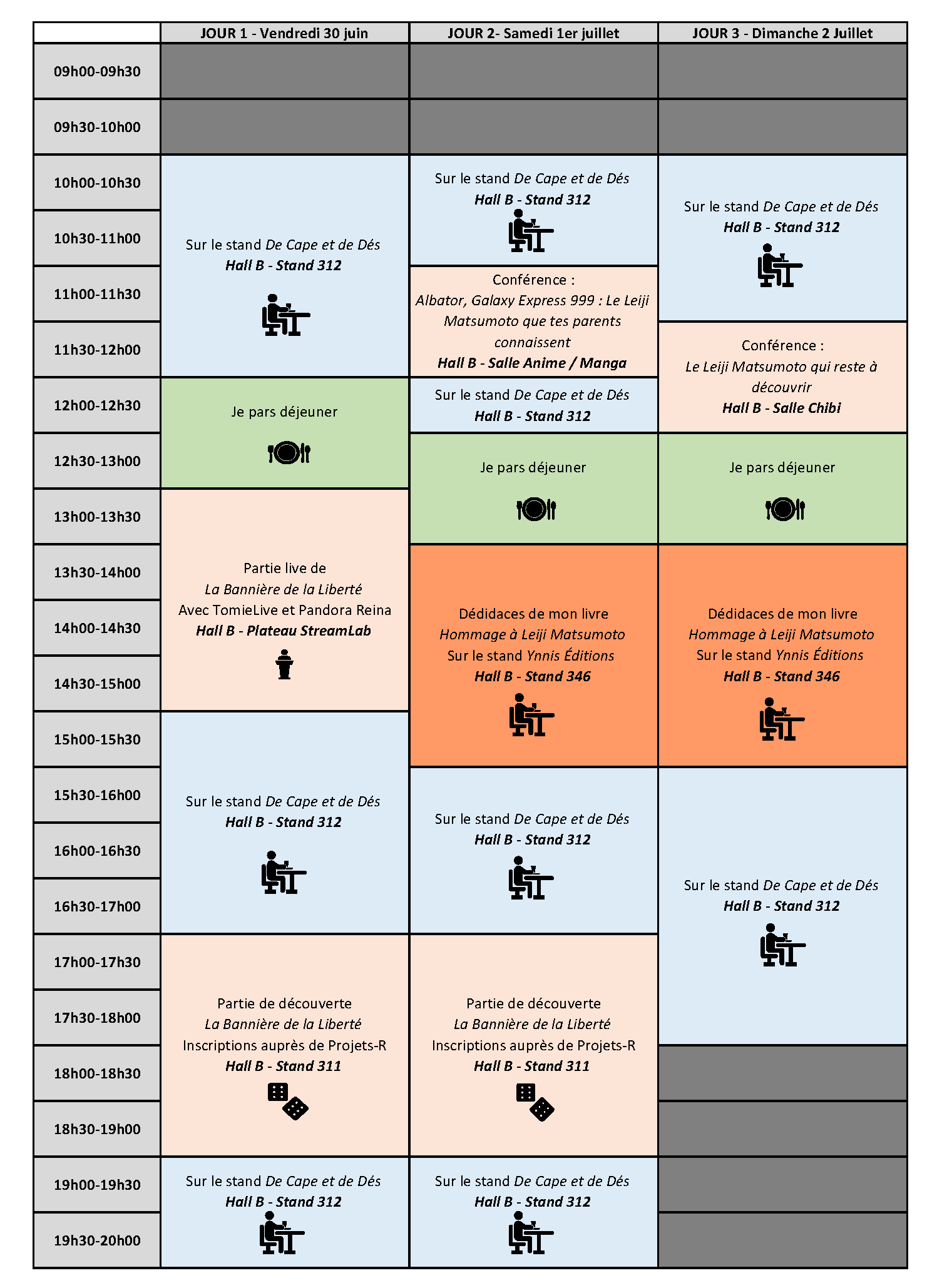 Outre diverses animations en hommage au regretté Leiji Matsumoto (mon livre Hommage à Leiji Matsumoto sera disponible en avant-première sur le stand des éditions Ynnis), je devrais également (si tout se passe bien) avoir les premiers exemplaires du livret de découverte de La Bannière de la Liberté. Vous pourrez me retrouver sur le stand de l’association De Cape et de Dé, et des parties de démo de La Bannière… sont également au programme.